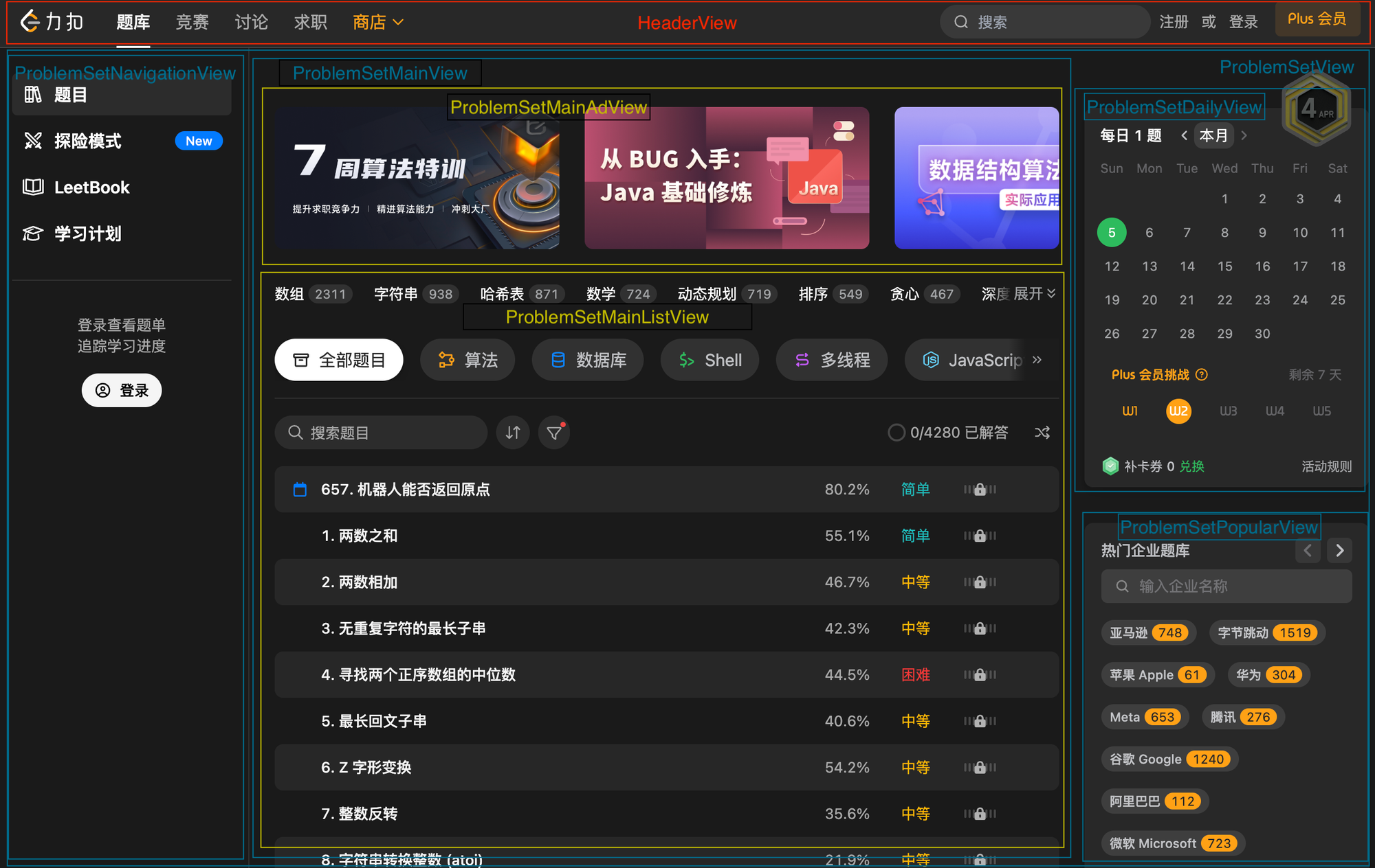 视图组件用来组织构建整个网页的功能布局。以力扣题库页面为例,我们可以自然地将页面以树形结构分层分割为以下的模块:
